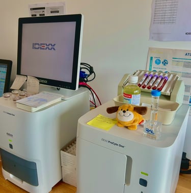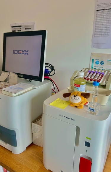 Des analyseurs sanguins rapides et performants permettent d'effectuer un grand panel d'examens : analyses biochimiques et analyse-numération formule sanguine. Nous avons les résultats immédiatement ce qui permet d'affiner au mieux notre diagnostic.